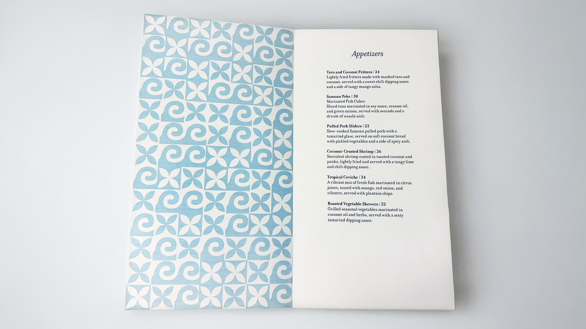 Designed a name, logo, supporting pattern, and menu for a fictional fine dining Samoan restaurant.